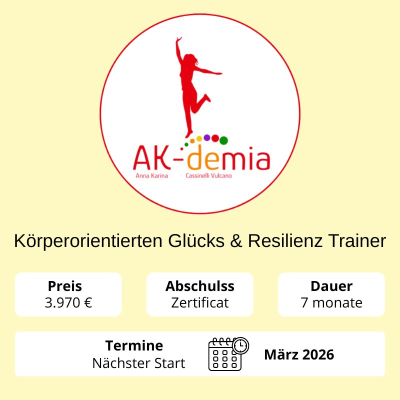 Entdecke die Kunst, Glück und Resilienz durch den Körper zu fördern. In unserer einzigartigen Ausbildung zum Körperorientierten Glücks & Resilienz Trainer kombinieren wir bewährte Methoden aus Embodiment, Yoga, Autogenem Training und verschiedenen psychologischen Ansätzen wie Psychodrama, Gestalttherapie, TZI und Transaktionsanalyse. Dieser umfassende Kurs ist darauf ausgelegt, Dir die Fähigkeiten und das Wissen zu vermitteln, um andere auf ihrem Weg zu innerem Glück und starker Resilienz zu begleiten.